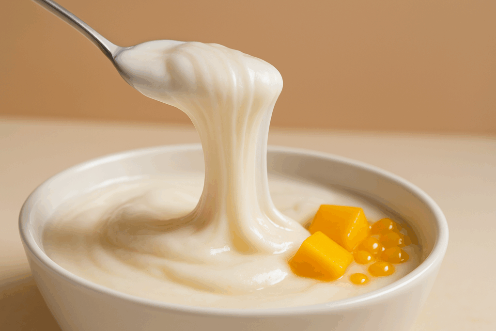 Zapomeňte na krémovost řeckého jogurtu a lehkost skyrů. Tady jde o texturu, která vás donutí přemýšlet, jestli jíte dezert, nebo si hrajete s jídlem. Natahovací jogurt se zahřívá a míchá s tapiokovým škrobem, až získá pružnost a lehkou žvýkavost. Ten pocit je někde mezi marshmallow, mochi a hustou syrskou zmrzlinou. Oči tomu nevěří, ale mozek chce víc.
